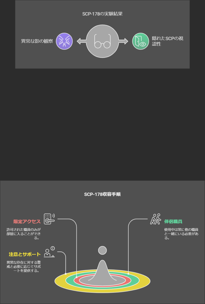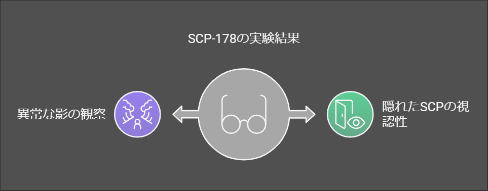 - 実験2: SCP-178を装着した被験者が、他のSCPオブジェクトの近くにいると、視認できる異常な影や形状が確認されました。これにより、SCP-178が他の異常存在に対しても影響を与える可能性が示唆されました。