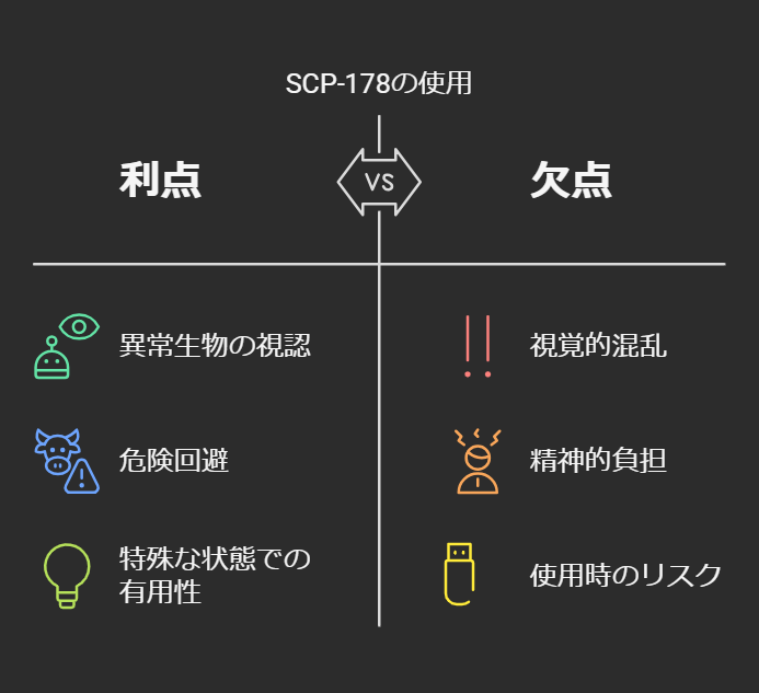 - SCP-178を装着した職員は、異常な存在に対する注意を怠らないように指示されており、必要に応じて心理的サポートが提供されます。