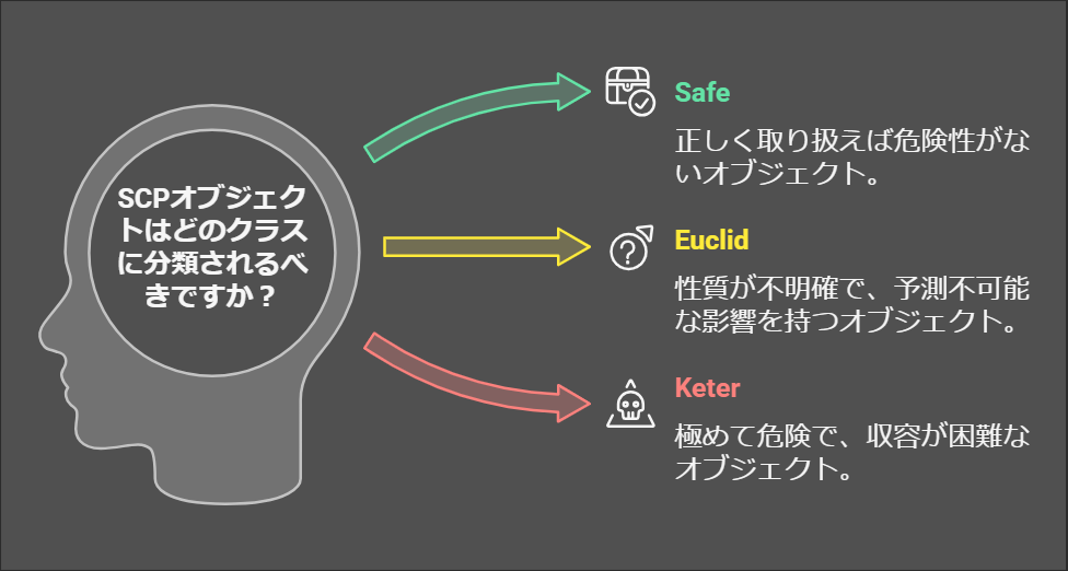 SCP財団が管理するオブジェクトは、それぞれ固有の番号が割り当てられ、分類されています。これらは、収容の難易度や危険性に応じて以下のクラスに分けられます: