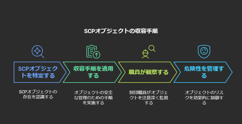 各SCPオブジェクトには特定の収容手順が定められており、それに従うことでオブジェクトの危険性を管理します。これらの手順は詳細であり、財団の職員による綿密な観察と対応が求められます。